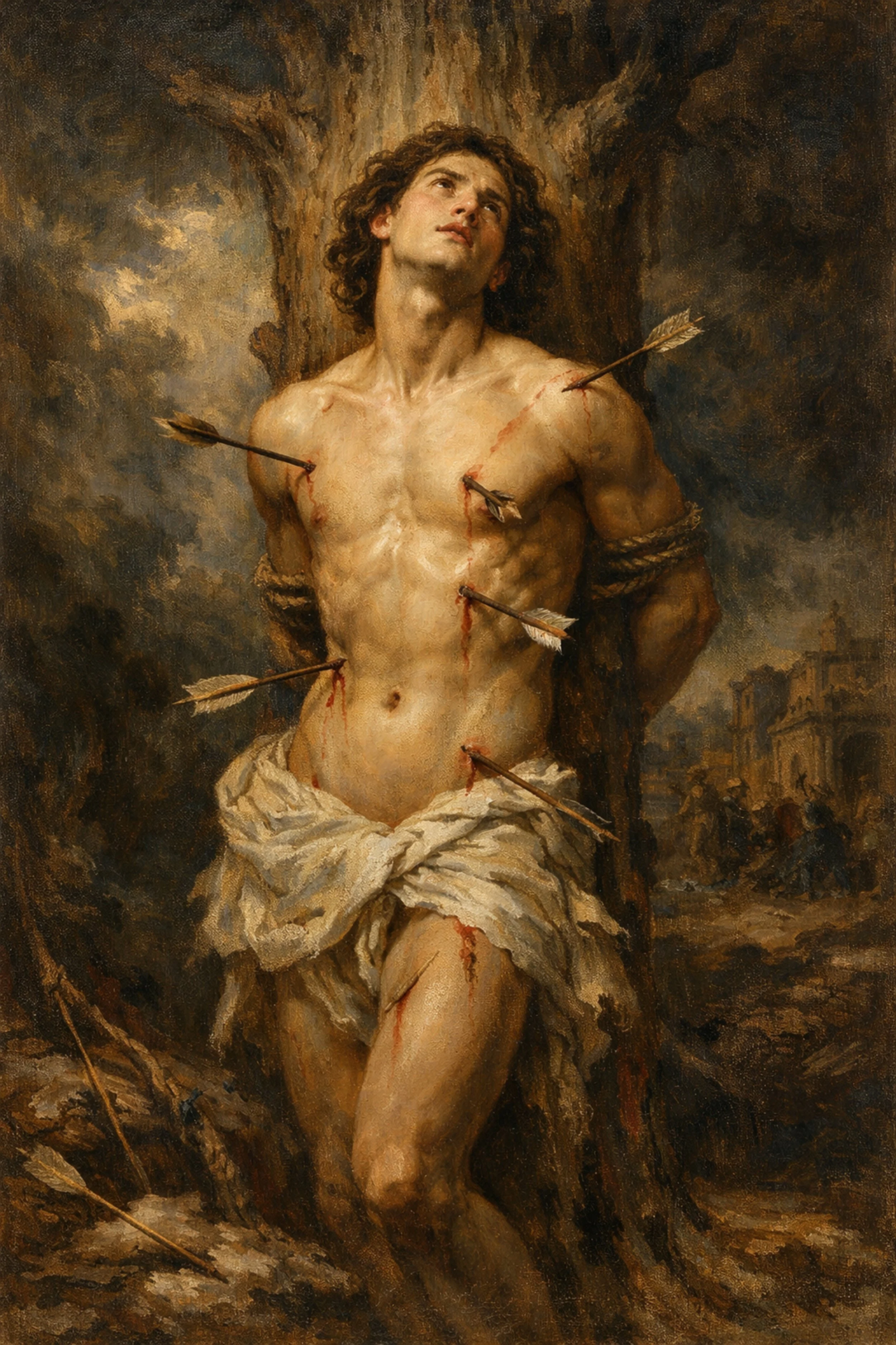 In artwork, St. Sebastian is depicted with arrows shot into his body, often tied to a post or a tree. His second execution is virtually never depicted. (According to catholic.org)